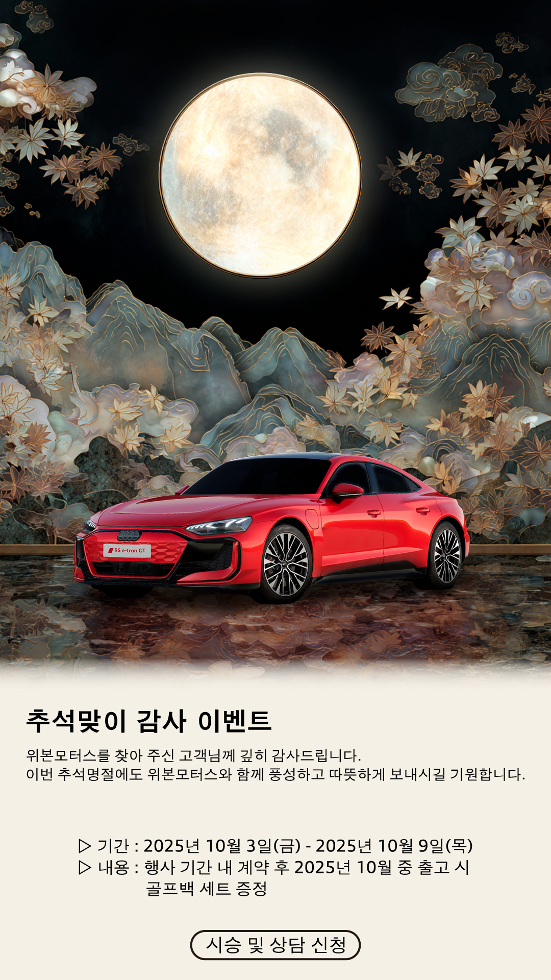 All 스포트백 SUV 세단 쿠페 카브리올레 Avant Audi e-tron GT Model 보기 (2) Audi A6 e-tron Model 보기 (2) Audi Q4 e-tron Model 보기 (2) Audi Q6 e-tron Model 보기 (2) Audi Q8 e-tron Model 보기 (3) Audi A3 Model 보기 (1) Audi A4 Model 보기 (1) Audi A5 Model 보기 (5) Audi A6 Model 보기 (2) Audi A7 Model 보기 (3) Audi A8 Model 보기 (3) Audi Q3 Model 보기 (2) Audi Q5 Model 보기 (2) Audi Q7 Model 보기 (2) Audi Q8 Model 보기 (2) The new Audi S e-tron GT 자세히보기 The new Audi RS e-tron GT performance 자세히보기 The new Audi A6 e-tron 자세히보기 The new Audi S6 e-tron 자세히보기 Q4 e-tron 자세히보기 Q4 Sportback e-tron 자세히보기 Q6 e-tron 자세히보기 SQ6 e-tron 자세히보기 Q8 e-tron 자세히보기 Q8 Sportback e-tron 자세히보기 SQ8 Sportback e-tron 자세히보기 A3 자세히보기 RS 3 자세히보기 A4 자세히보기 The new Audi A5 자세히보기 A5 Coupé 자세히보기 A5 Sportback 자세히보기 A5 Cabriolet 자세히보기 The new Audi S5 자세히보기 A6 자세히보기 RS 6 Avant performance 자세히보기 A7 Sportback 자세히보기 A7 Sportback TFSI e 자세히보기 RS 7 performance 자세히보기 A8 L 자세히보기 S8 L 자세히보기 A8 자세히보기 Q3 자세히보기 Q3 Sportback 자세히보기 The new Audi Q5 자세히보기 The new Audi Q5 SportBack 자세히보기 Q7 자세히보기 SQ7 TFSI 자세히보기 Q8 자세히보기 RS Q8 performance 자세히보기